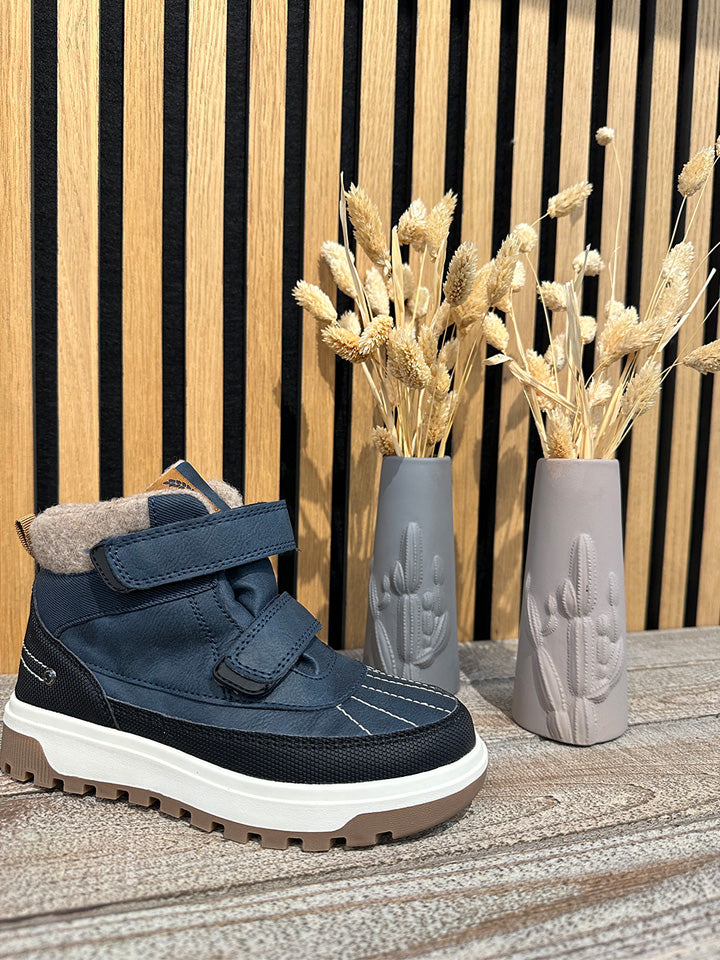 Fotografiet viser en robust, vandafvisende vinterstøvle i mørkeblå og sort med lyse kontrastsyninger. Støvlen har to brede velcrolukninger, en blød uldagtig fortykning ved skaftet og en lille trækkrog bagpå. Den kraftige hvide mellemsål og rillede brune gummiydersål giver god stød- og skridsikring. Designet kombinerer funktionalitet og komfort, velegnet til børn eller voksne, der har brug for varme og stabilitet i koldt vejr.