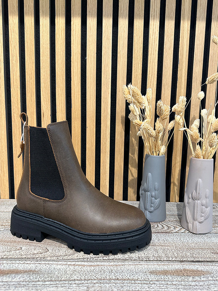 Et enkelt, stilrent nærbillede af en brun Chelsea-støvle i læder med kraftig, sort sål. Støvlen har klassiske elastiske sider, kontrastsømme og en praktisk trækstrop bagpå. Overfladen er mat og jævnt patineret, hvilket giver et robust og samtidig elegant udtryk. Den tykke, profilrende sål sikrer greb og holdbarhed, hvilket gør støvlen velegnet til både hverdag og mere rå, urbane looks.